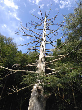 柳生十兵衛三厳が諸国漫遊に旅立つ前、先祖の墓地に植えたものだとされています。樹齢は350年ほどになりますが、昭和48年に二度の落雷により、枯れてしまい、現在は2代目が横で大きくなっていま